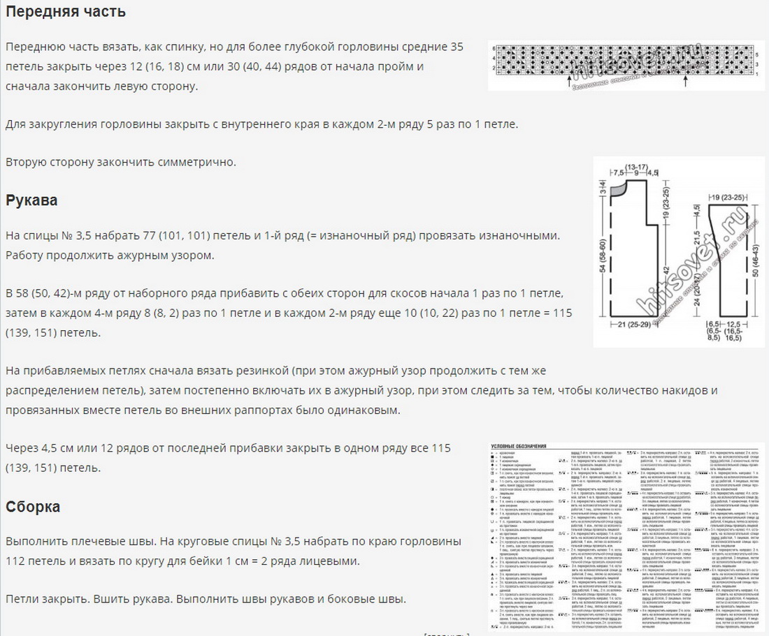 Размеры пуловера: 36 (42-44, 46-48). Резинка: вязать попеременно 1 лицевую скрещенную, 1 изнаночную петлю. В изнаночных рядах скрещенные петли провязывать изнаночными скрещенными. Ажурный узор: вязать по схеме. В ширину начинать с 14 петель перед 1-й стрелкой, повторять раппорт = 24 петли между стрелками, заканчивать 15 петлями после 2-й стрелки. В высоту повторять с 1-го по 16-й ряд. Плотность вязания пуловера: 29,5 петель на 24,5 ряда соответствует 10 на 10 см, связано ажурным узором спицами № 3,5.